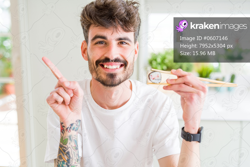 Young man eating asian sushi using chopsticks very happy pointing with hand and finger to the side