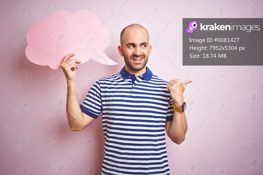 Young man holding speech bubble with blank space for message over pink isolated background pointing and showing with thumb up to the side with happy face smiling - Kraken Images
