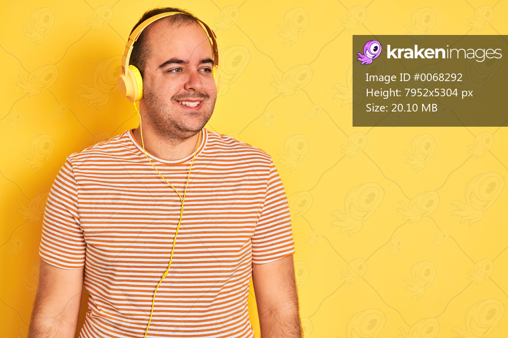 Young man listening to music using headphones standing over isolated yellow background looking away to side with smile on face, natural expression. Laughing confident. - Kraken Images