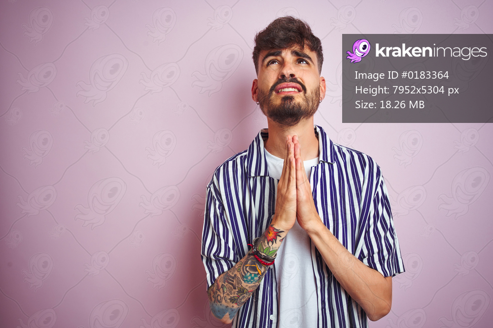 Young man with tattoo wearing striped shirt standing over isolated pink background begging and praying with hands together with hope expression on face very emotional and worried. Asking for forgiveness. Religion concept. - Kraken Images