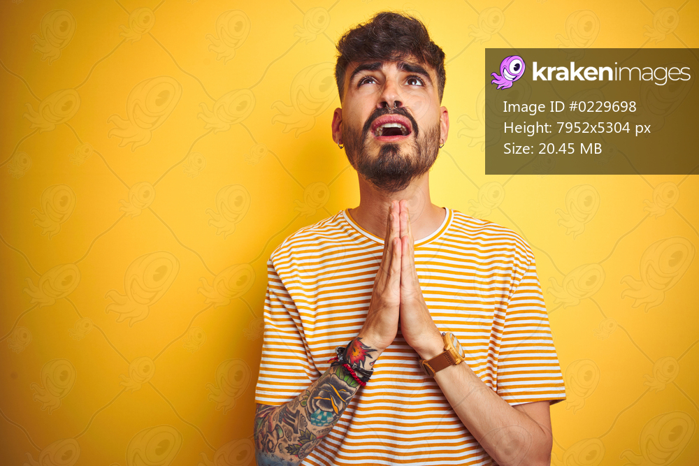 Young man with tattoo wearing striped t-shirt standing over isolated yellow background begging and praying with hands together with hope expression on face very emotional and worried. Asking for forgiveness. Religion concept. - Kraken Images