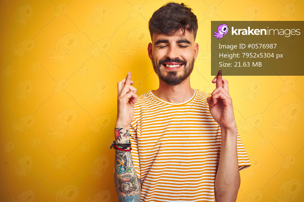 Young man with tattoo wearing striped t-shirt standing over isolated yellow background gesturing finger crossed smiling with hope and eyes closed. Luck and superstitious concept. - Kraken Images
