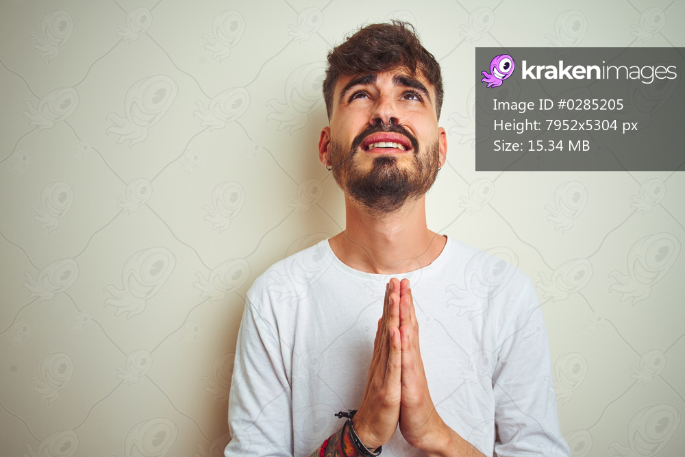 Young man with tattoo wearing t-shirt standing over isolated white background begging and praying with hands together with hope expression on face very emotional and worried. Asking for forgiveness. Religion concept. - Kraken Images