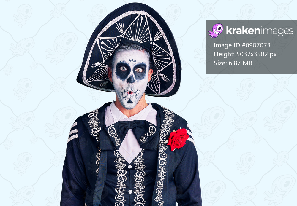 Young man wearing day of the dead costume over background afraid and shocked with surprise expression, fear and excited face.