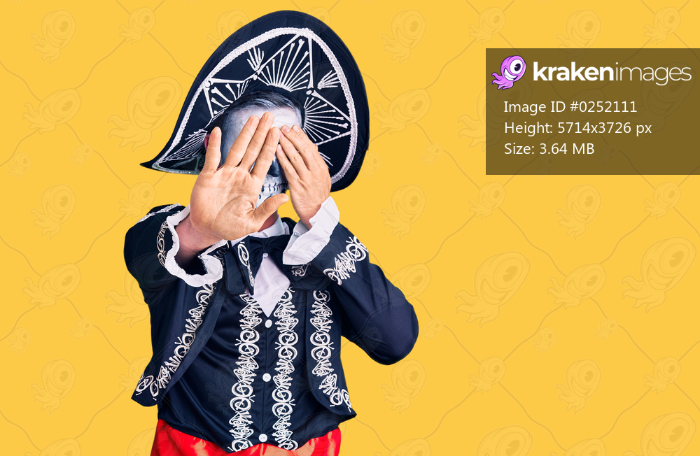 Young man wearing day of the dead costume over background covering eyes with hands and doing stop gesture with sad and fear expression. embarrassed and negative concept. - Kraken Images