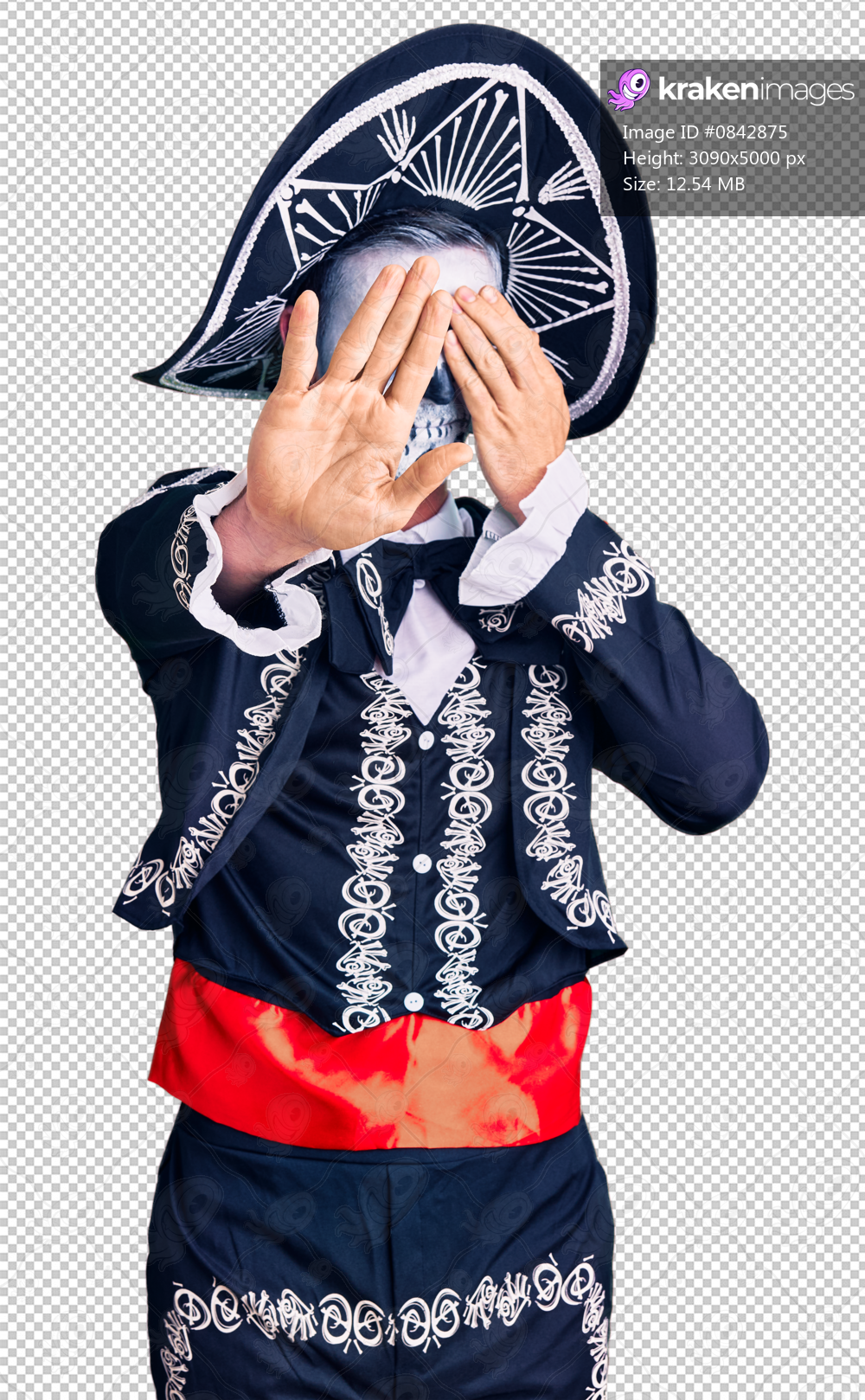 Young man wearing day of the dead costume over background covering eyes with hands and doing stop gesture with sad and fear expression. embarrassed and negative concept. - Kraken Images