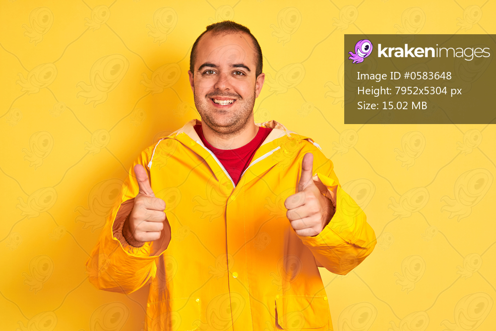 Young man wearing rain coat standing over isolated yellow background approving doing positive gesture with hand, thumbs up smiling and happy for success. Winner gesture. - Kraken Images