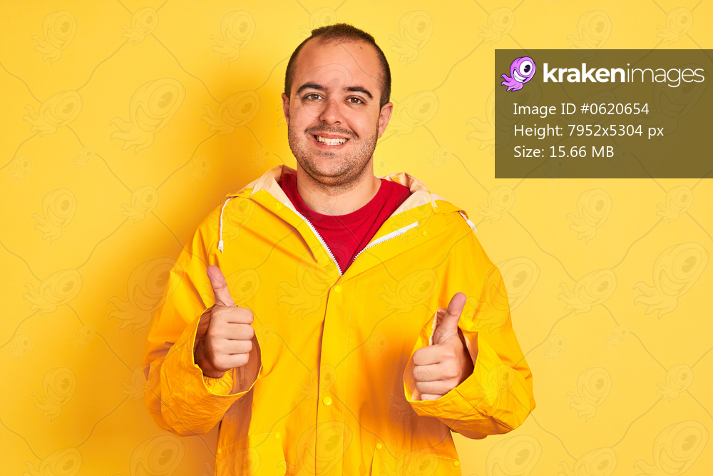 Young man wearing rain coat standing over isolated yellow background success sign doing positive gesture with hand, thumbs up smiling and happy. Cheerful expression and winner gesture. - Kraken Images