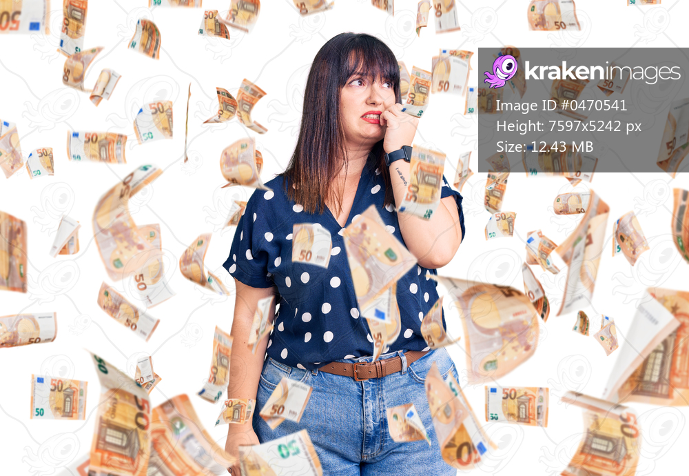 Young plus size woman wearing casual clothes looking stressed and nervous with hands on mouth biting nails. anxiety problem.