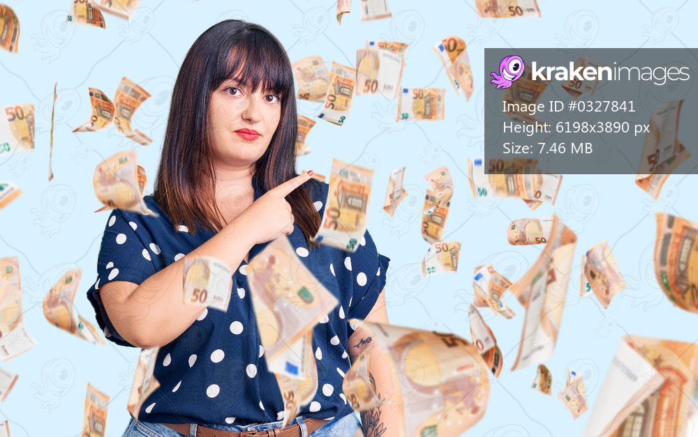 Young plus size woman wearing casual clothes pointing with hand finger to the side showing advertisement, serious and calm face