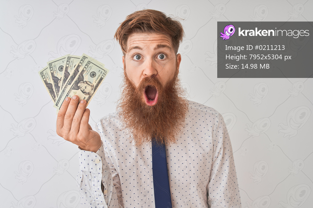 Young redhead irish businessman holding dollars standing over isolated white background scared in shock with a surprise face, afraid and excited with fear expression - Kraken Images