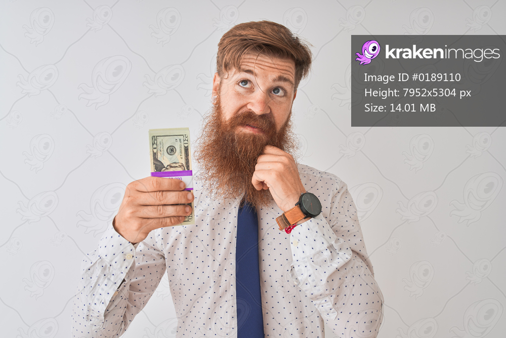 Young redhead irish businessman holding dollars standing over isolated white background serious face thinking about question, very confused idea