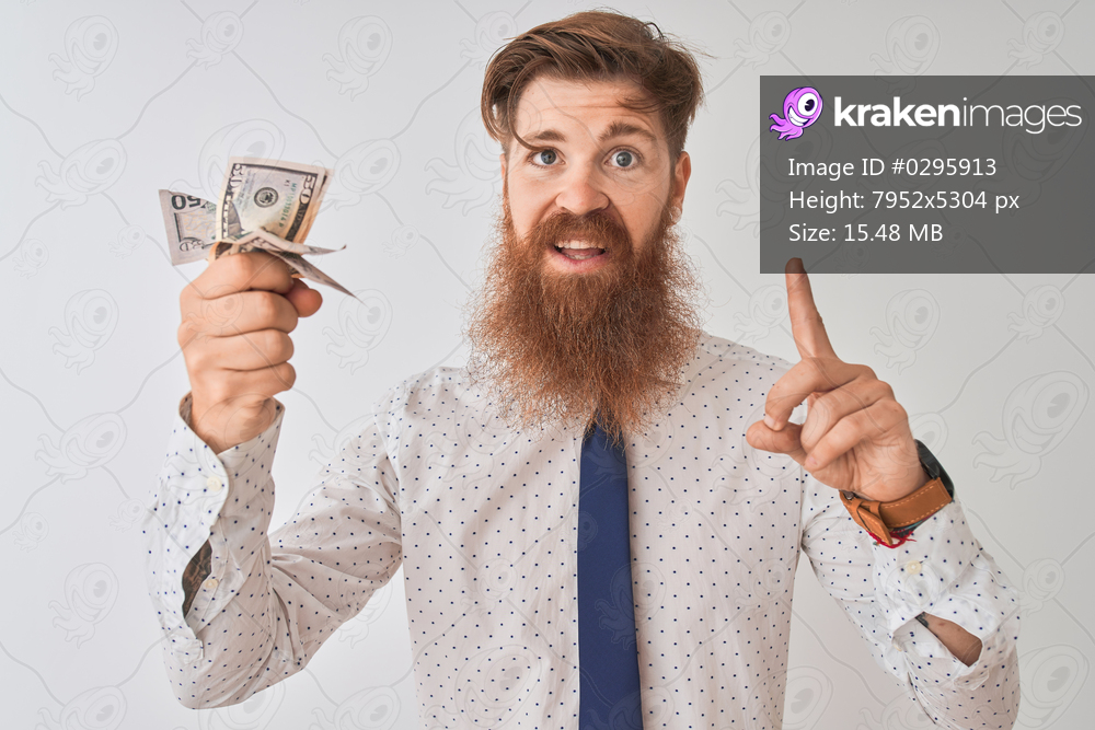Young redhead irish businessman holding dollars standing over isolated white background surprised with an idea or question pointing finger with happy face, number one - Kraken Images