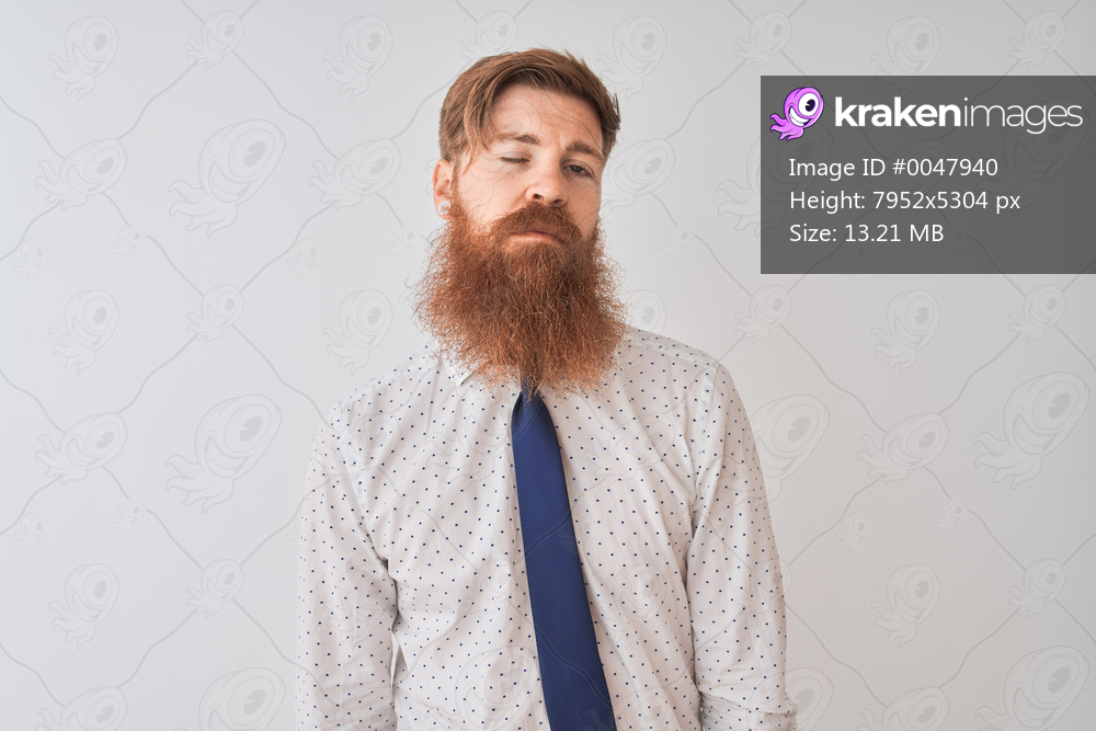 Young redhead irish businessman standing over isolated white background looking sleepy and tired, exhausted for fatigue and hangover, lazy eyes in the morning. - Kraken Images
