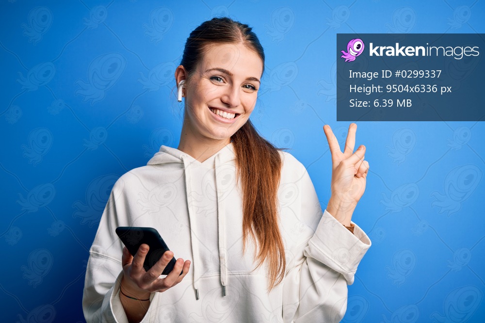Young redhead sportswoman doing sport listening to music using earphones and smartphone smiling with happy face winking at the camera doing victory sign with fingers. Number two. - Kraken Images