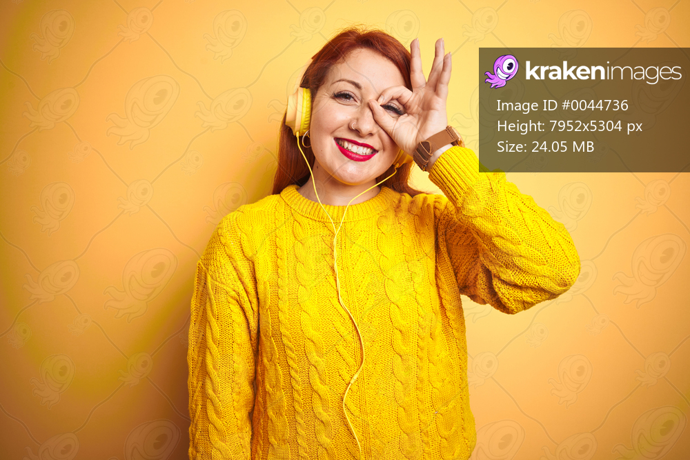 Young redhead woman listening to music using headphones over yellow isolated background doing ok gesture with hand smiling, eye looking through fingers with happy face. - Kraken Images