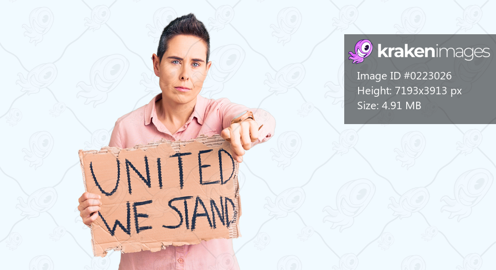 Young woman with short hair holding united we stand banner pointing with finger to the camera and to you, confident gesture looking serious