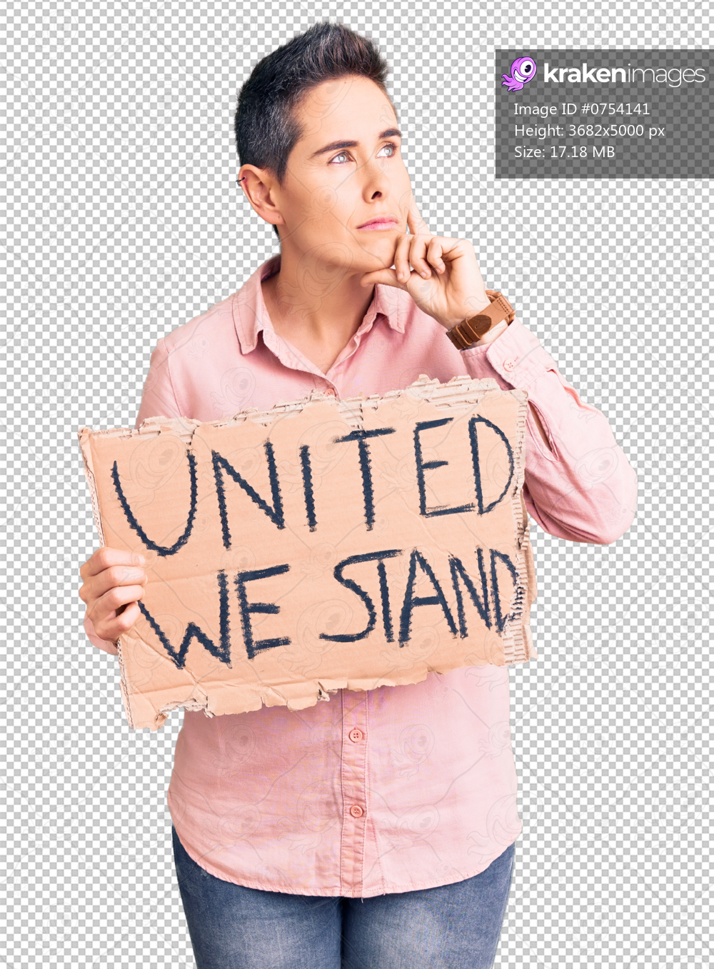 Young woman with short hair holding united we stand banner serious face thinking about question with hand on chin, thoughtful about confusing idea