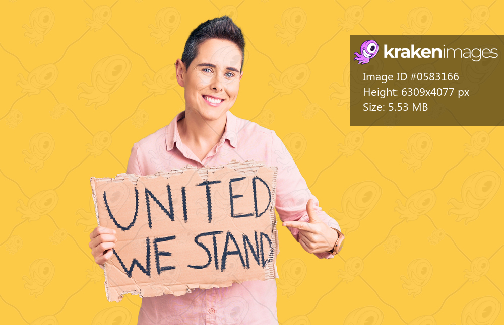 Young woman with short hair holding united we stand banner smiling happy pointing with hand and finger