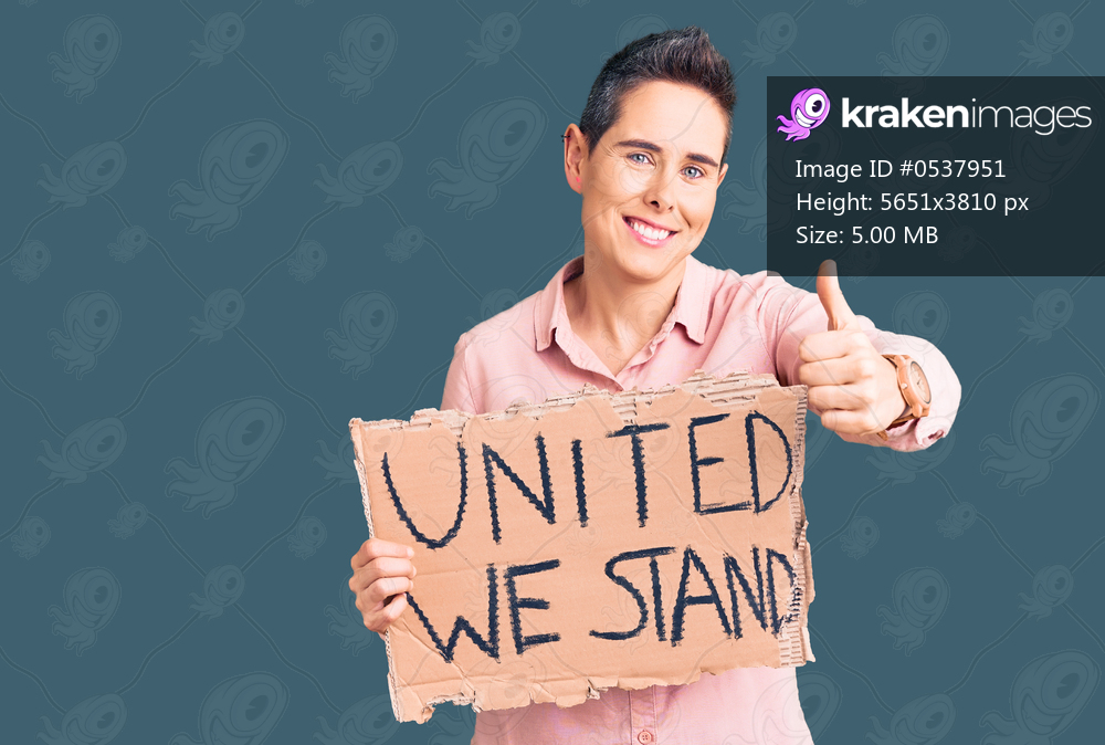 Young woman with short hair holding united we stand banner smiling happy and positive, thumb up doing excellent and approval sign