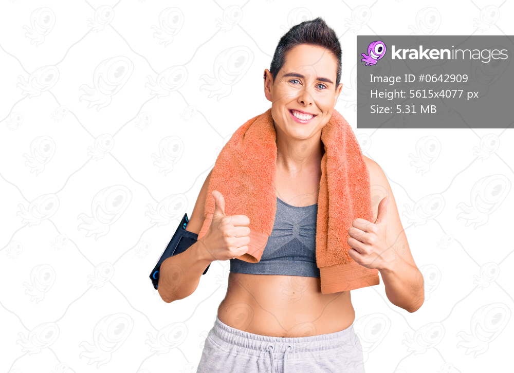 Young woman with short hair wearing sportswear and towel using smartphone success sign doing positive gesture with hand, thumbs up smiling and happy. cheerful expression and winner gesture. - Kraken Images